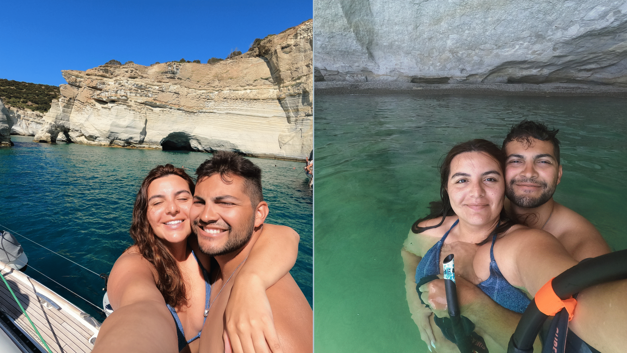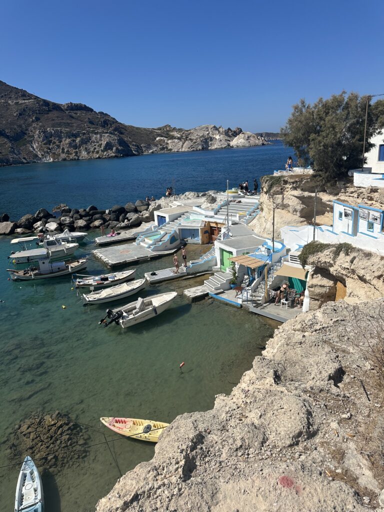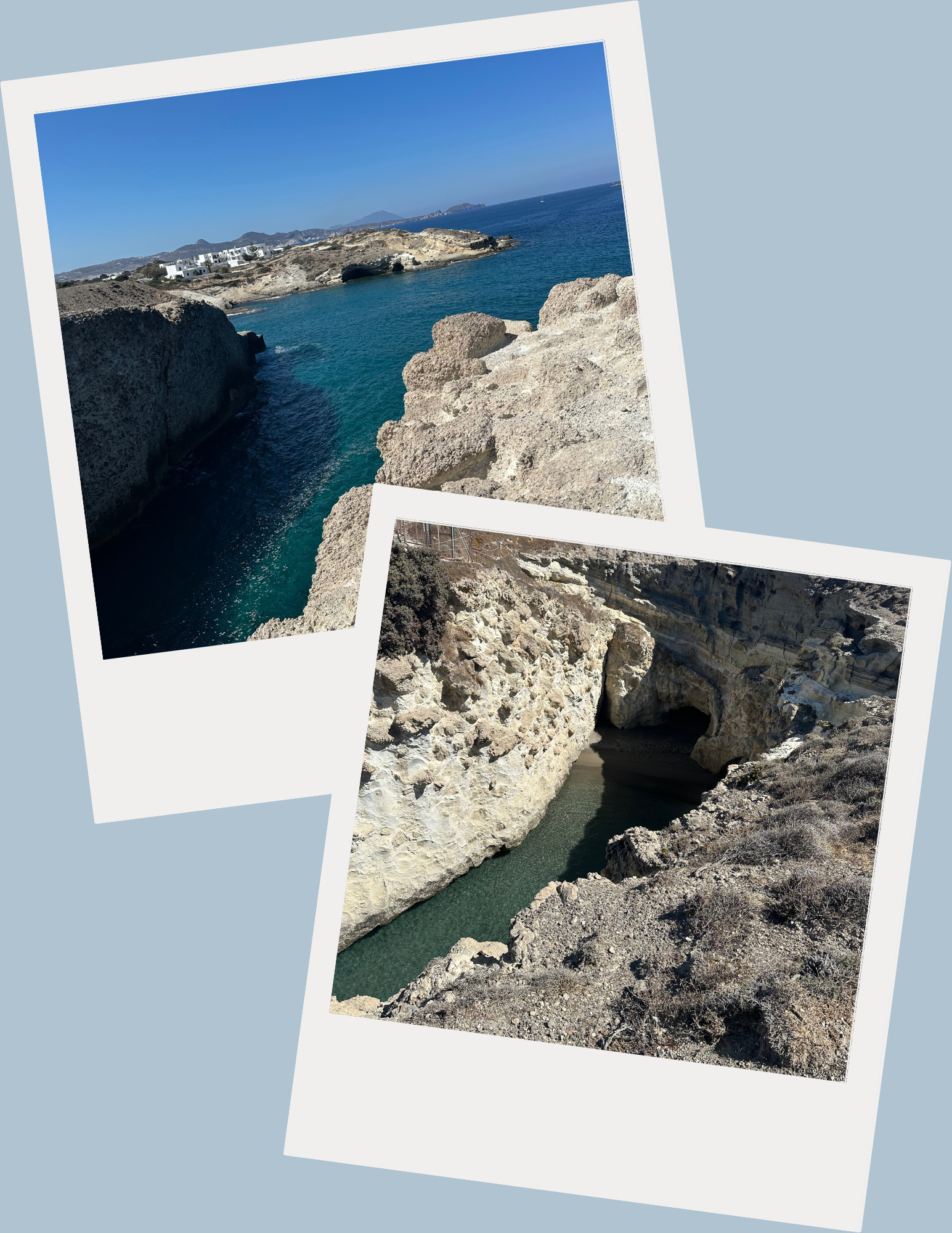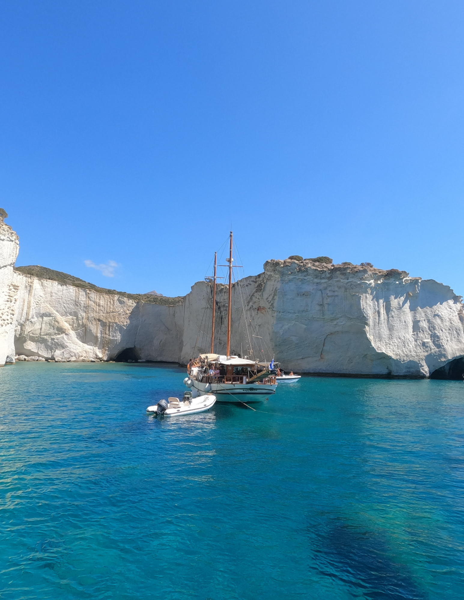One of the best decisions we made in Milos was seeing the island by boat. There are so many hidden caves, coves, and beaches that you simply cannot access by car. We did a full-day catamaran tour with snorkeling and lunch, and it ended up being one of the highlights of our entire Greece trip. Swimming in these secluded spots felt like something out of a dream and we even got to do some cliff jumping along the way. If you’re visiting Milos, I cannot recommend this enough.