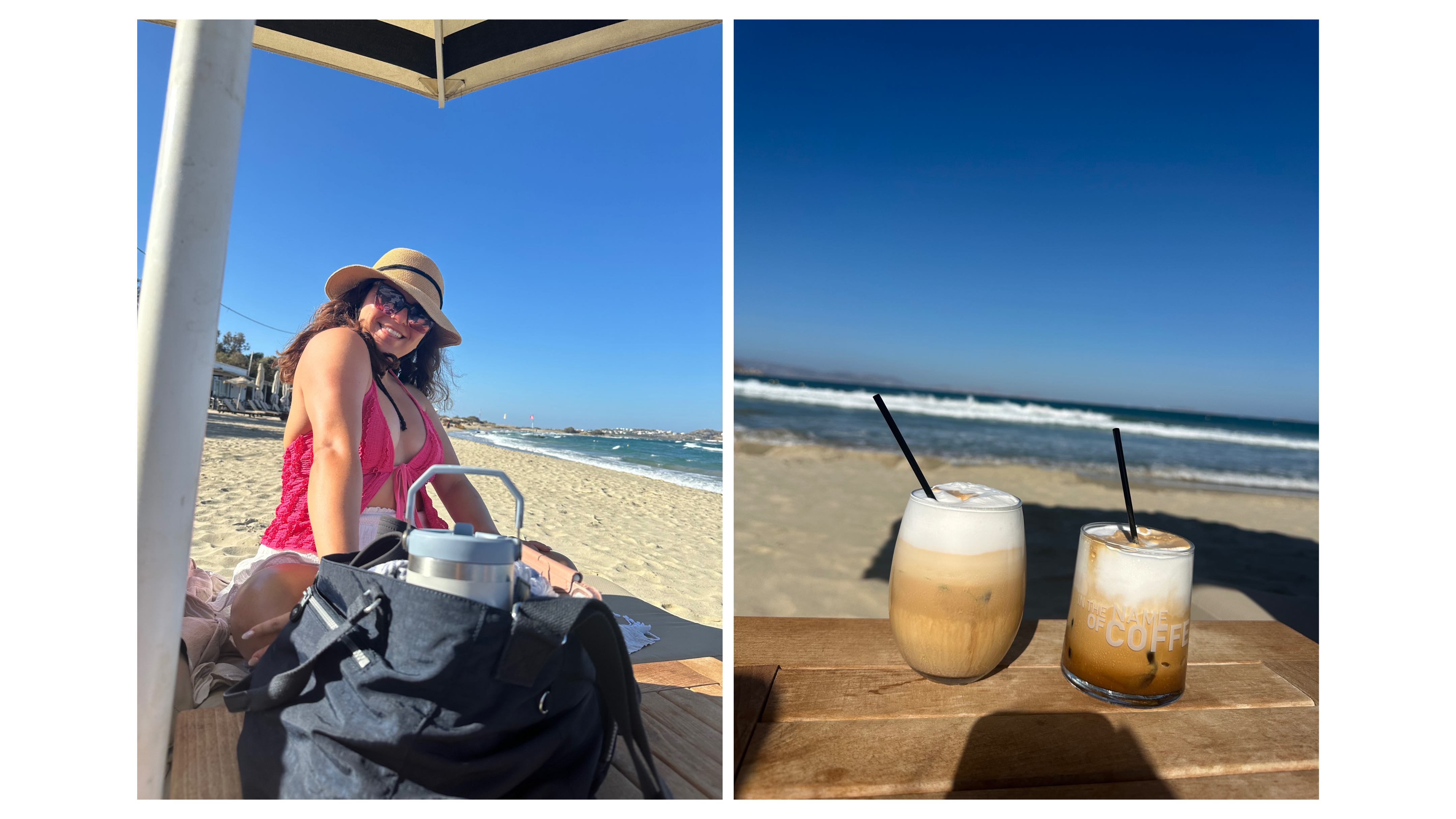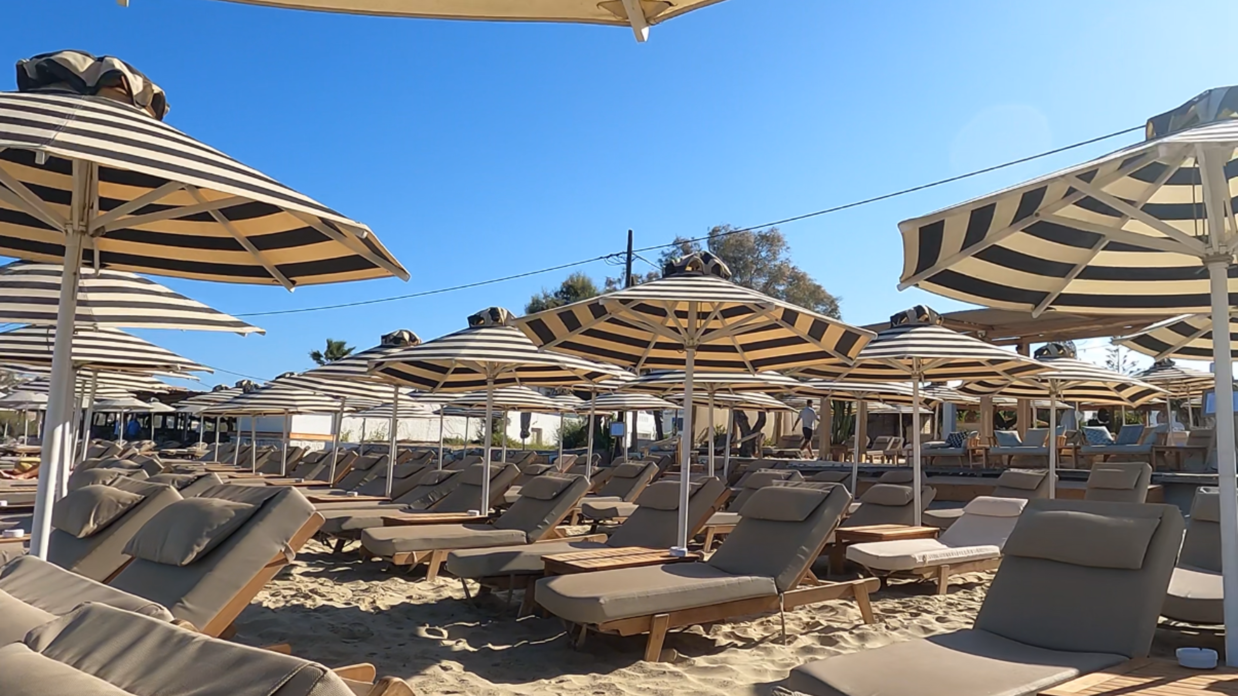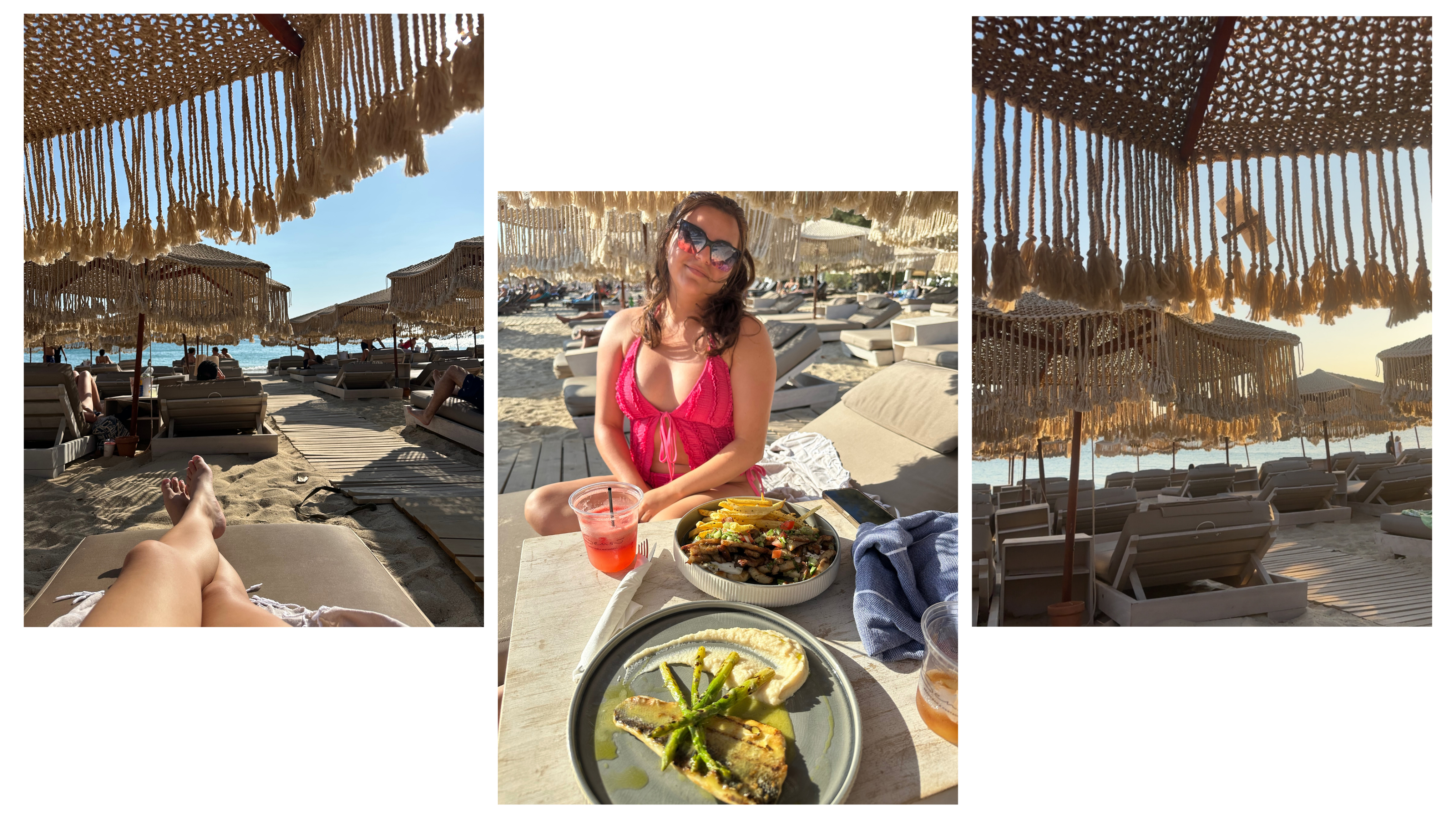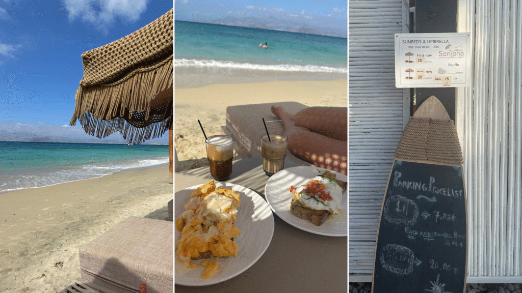 Santana Beach Club in Agia Anna is relaxed but refined. Sunbeds are free before 11:30 in the morning, and after that, prices vary by row, with a minimum spend depending on the season. We spent almost the whole day here and loved it. The food and drinks were really good, and it was the perfect way to enjoy a day on the beach!