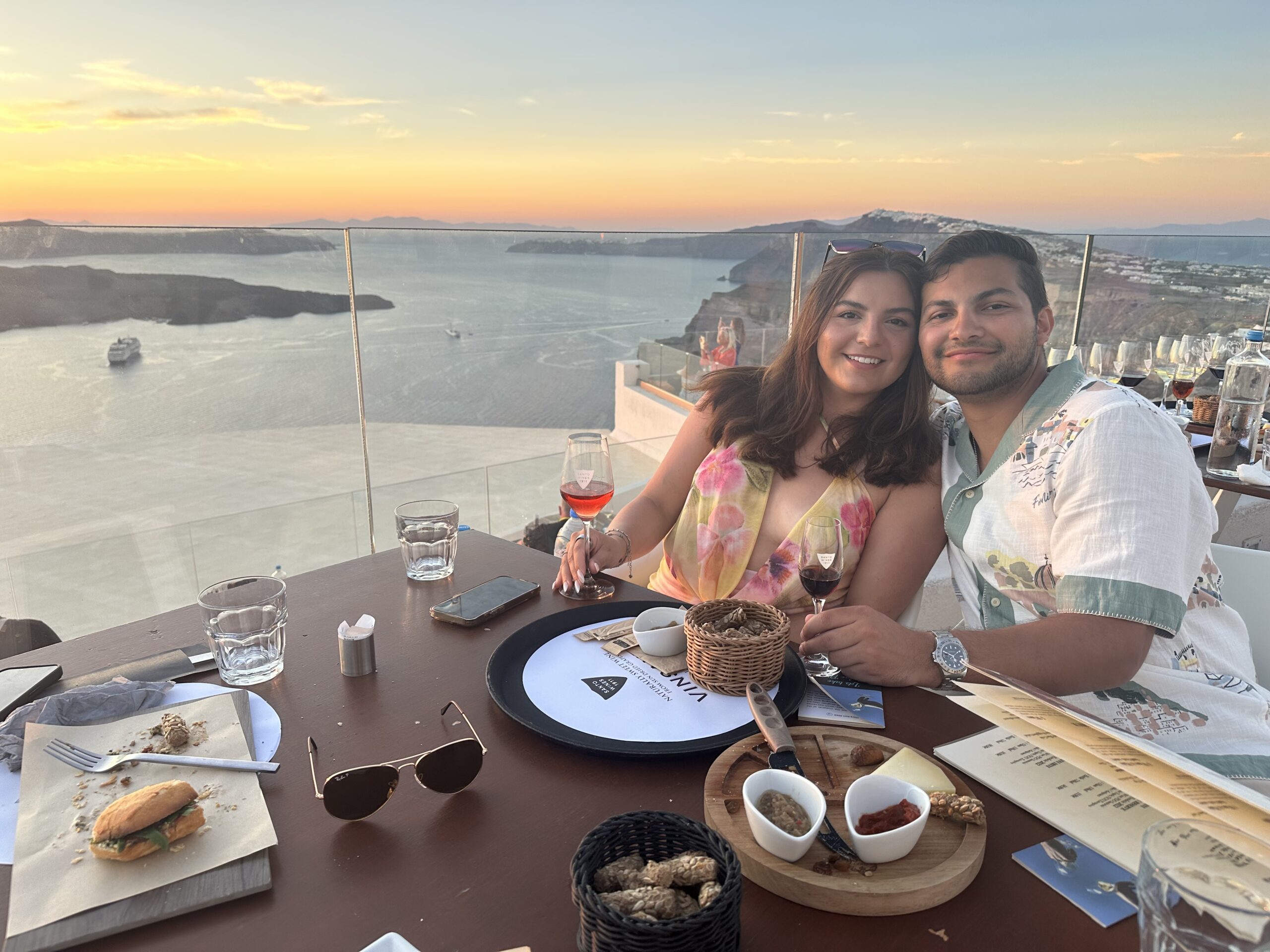 One of the most memorable experiences we had in Santorini was visiting Santo Wines during sunset. This winery is known for having one of the best panoramic views of the caldera, and watching the sun go down from here truly feels surreal.