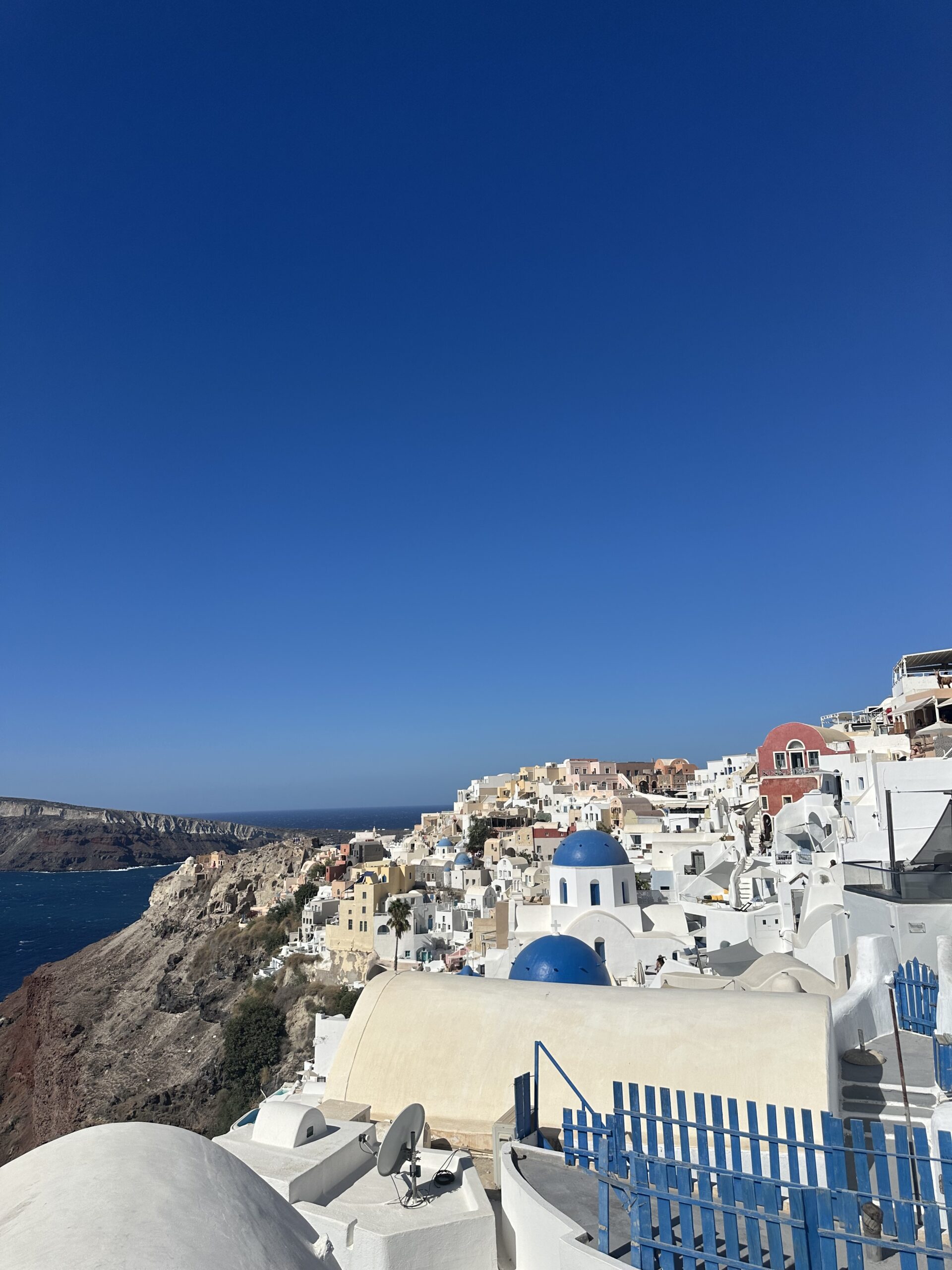 Oia: This is the Santorini you’ve seen everywhere, with blue domes, cliffside views, and iconic sunsets. It’s absolutely stunning and worth experiencing, but it is also the most crowded, especially later in the day. We loved exploring Oia, but personally preferred staying somewhere a bit more peaceful.