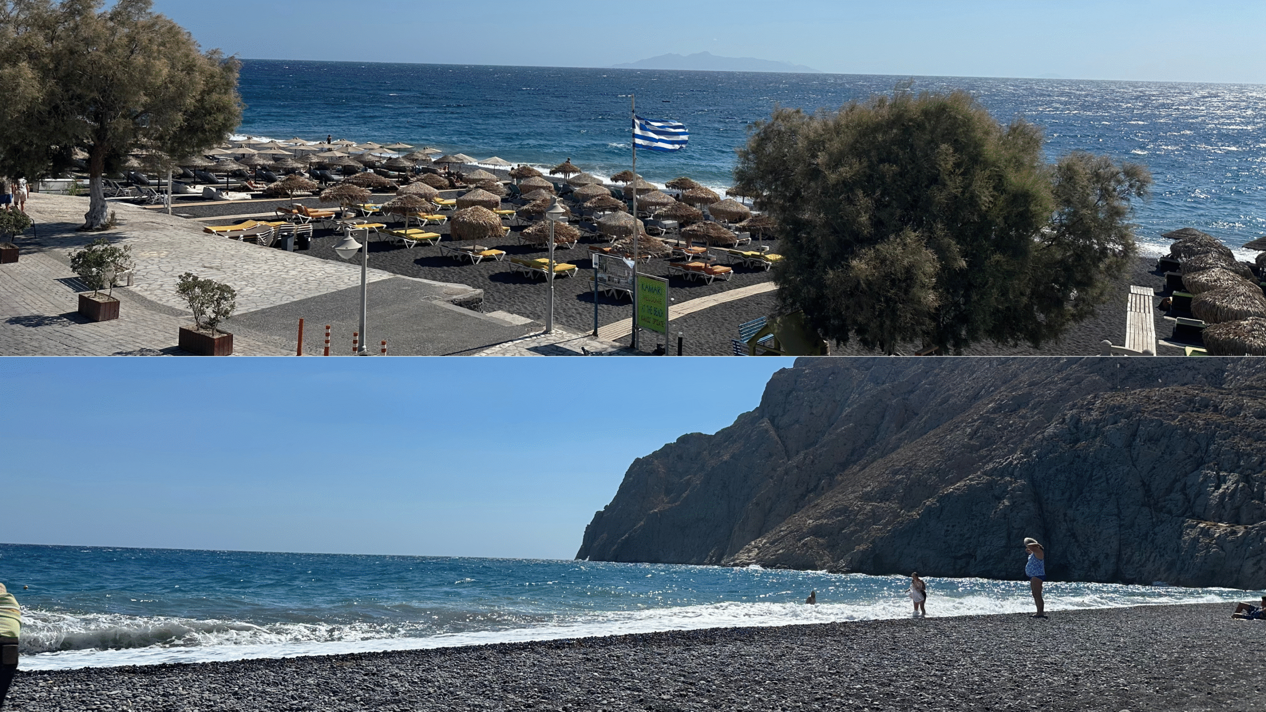 Kamari: If you’re looking to slow down, Kamari has a completely different feel from the caldera side. We spent time here relaxing at the black sand beach, and it was the perfect reset from the more crowded areas.