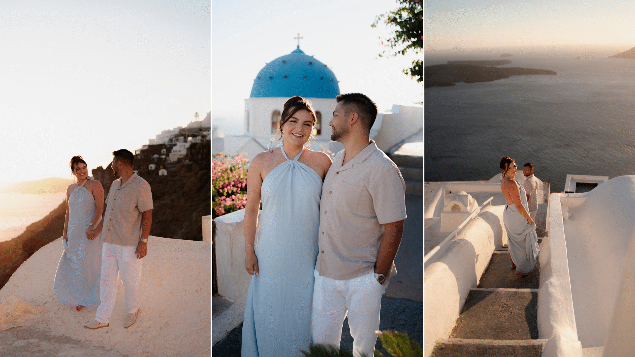 My husband and I did a professional photoshoot in Imerovigli during sunset, and it was easily one of the most special and memorable experiences of the trip. Imerovigli is known for its elevated views and slightly quieter atmosphere compared to Oia, which makes it an amazing location for photos. The backdrop of the caldera, white buildings, and blue accents creates the perfect setting.