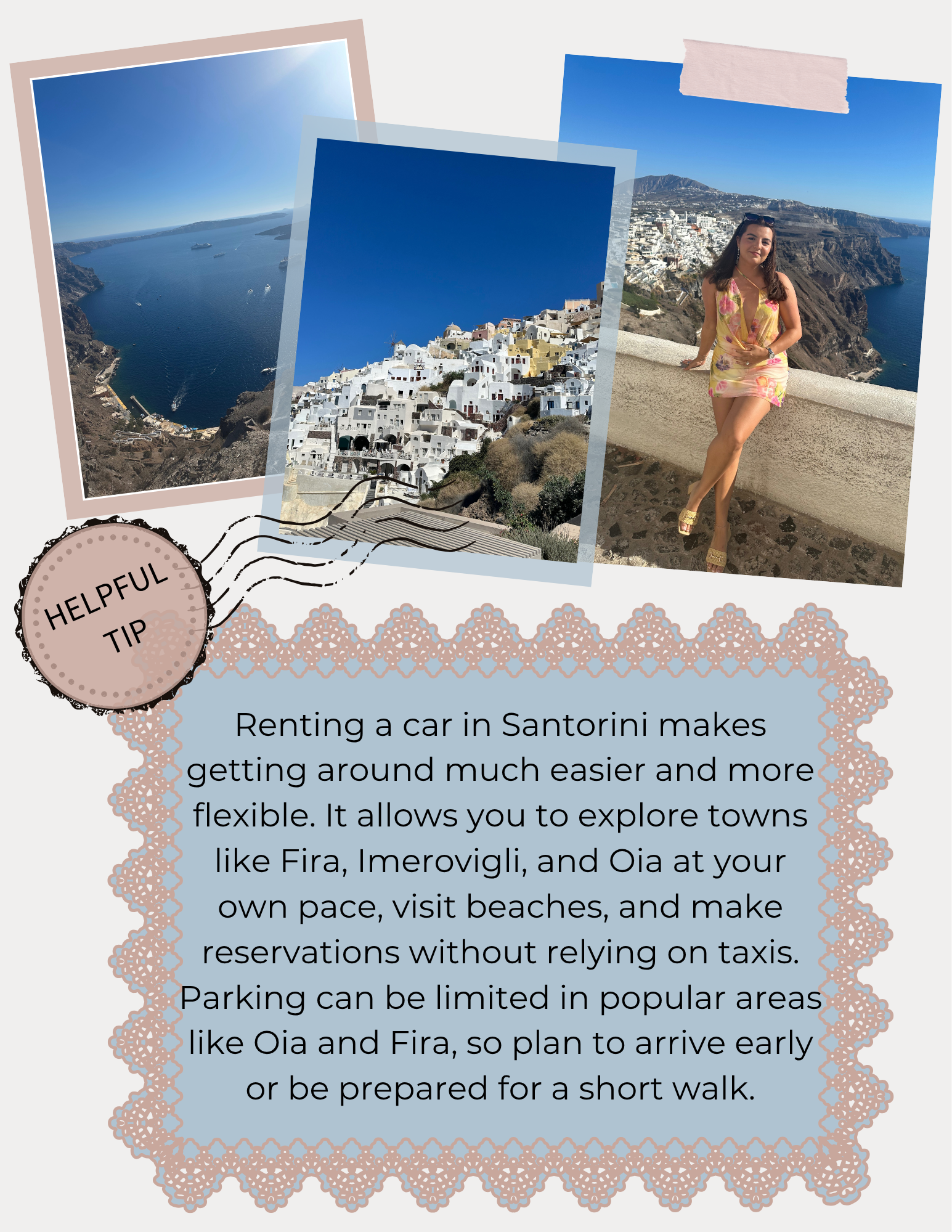 Wind is no joke. Santorini can get very windy, especially in the afternoons, so plan outfits accordingly and be careful with flowy dresses.