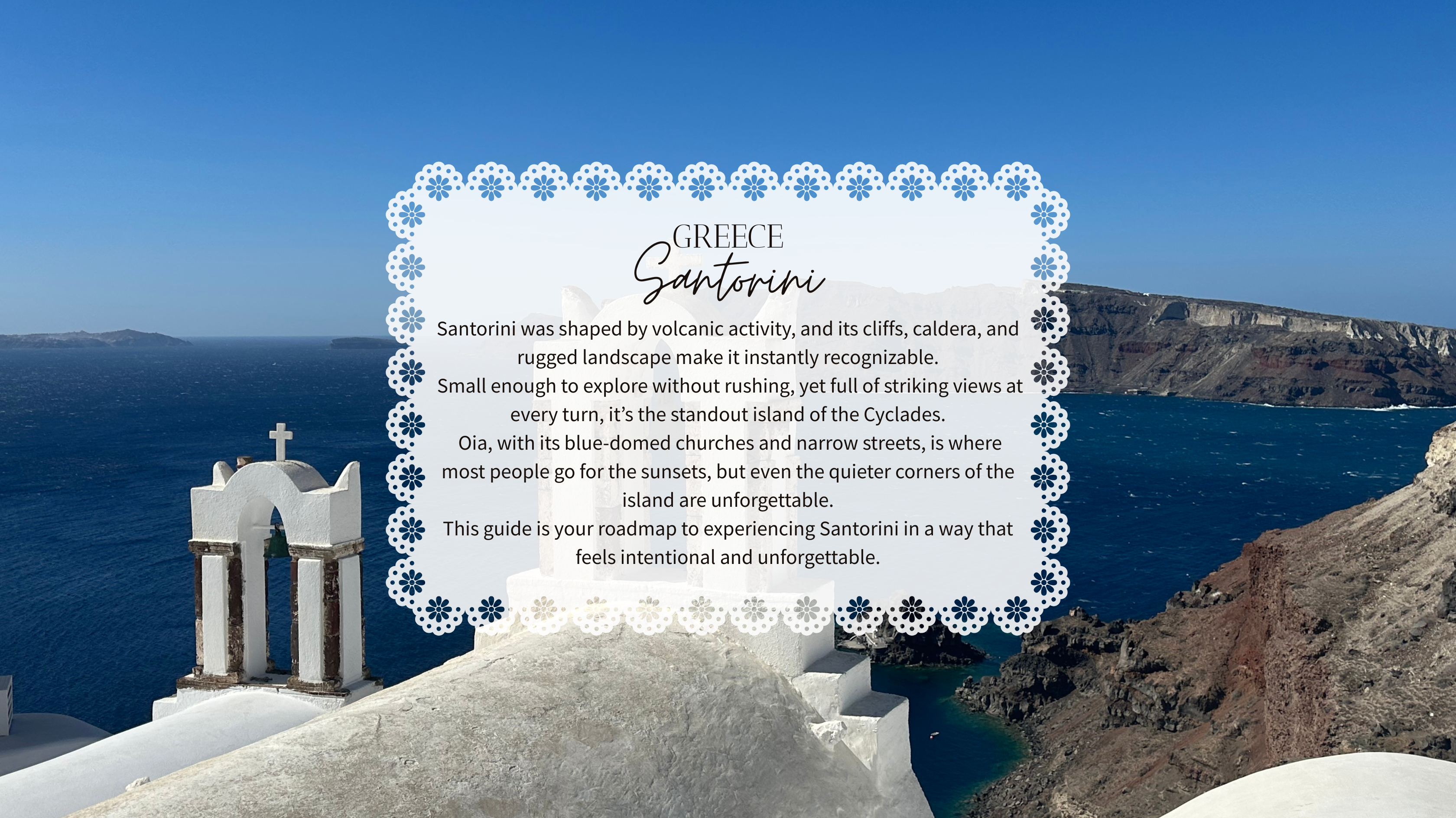 While Santorini is one of the most popular islands, it truly lives up to the hype when experienced intentionally. From slow mornings by the sea to golden hour dinners overlooking the caldera, every moment feels elevated and unforgettable.